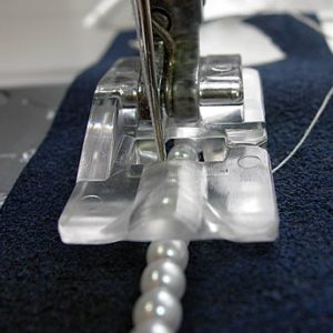 Helminauhan ompelujalalla kiinnität leveämmät helminauhat (2.5 – 4.0 mm). Jalan avulla valmistat mm. morsiusasuja ja iltapukuja. Paininjalka sopii 9mm:n koneisiin ja on pikakiinnityksellä.