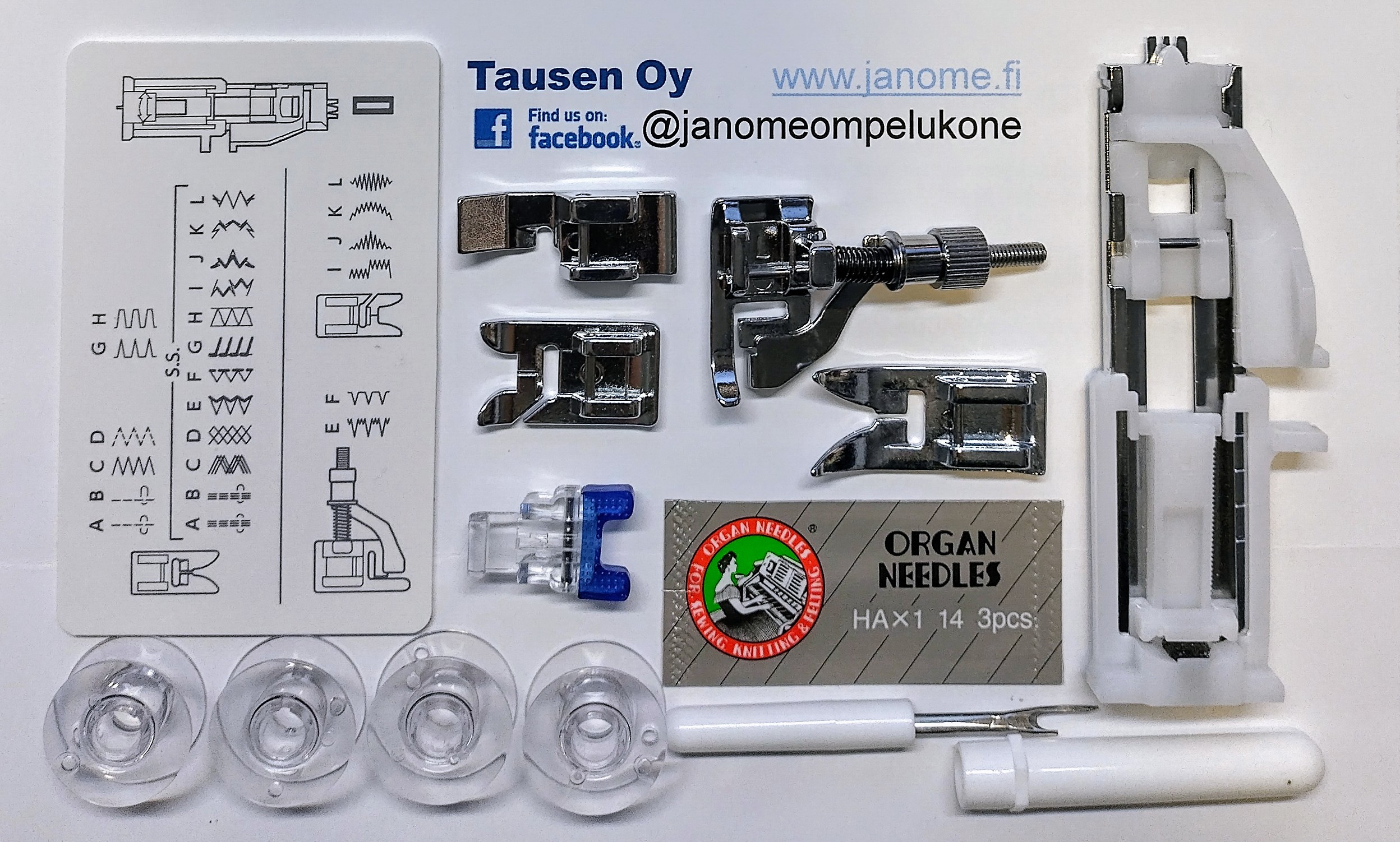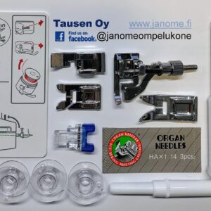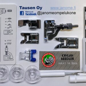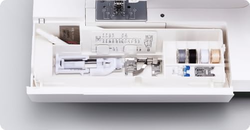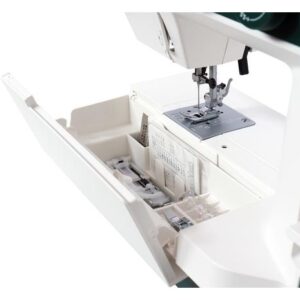 Koneesta löytyy vapaavarsi. Koneessa on myös normaalia leveämpi ompelupöytä. Ompelupöydästä löydät myös tilavan tarvikelaatikon