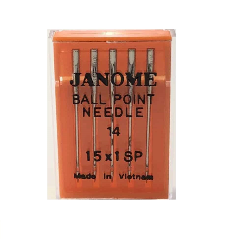 5 kpl Janomen 15x1SP erikoispallokärkineuloja kokoa 14/90. Soveltuu joustavien lycraa sisältävien paksumpien neuleiden ompeluun, ehkäisee hyppytikkiä.