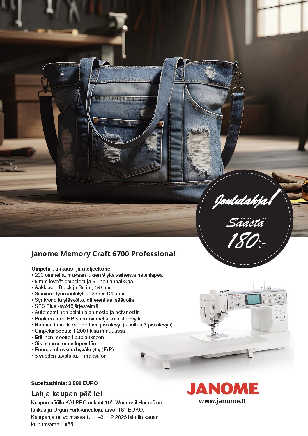 Memory Craft 6700P on ammattitason ompelukone upeilla puoliteollisilla toiminnoilla. Tämä ompelukone hyödyntää teollisten ompelukoneiden korkeaa ompelunopeutta (jopa 1200 tikkiä minuutissa). Tämän lisäksi ompelukoneessa on suuri työtila, kone on vahva ja vakaa ja koneessa on AcuFeed-syöttöjärjestelmä, mikä takaa sujuvan kankaan syöttymisen materiaalista toiseen. Voit käyttää ammattistason HP-pistolevyä ja HP-paininjalkaa tarkkaan ompeluun. Memory Craft 6700 Professional on kooltaan kuin mikä tahansa kodin ompelukone, se käyttää tavallista sähkövirtaa ja sitä on helppo kuljettaa. Koneessa on monia toimintoja, jotka tekevät ompelukoneen käyttämisestä helppoa kuten langanleikkaus, neulastop, paininjalan lisänosto, polvinostin ym. Tästä koneesta löydät kaikki ominaisuudet, jotka tekevät ompelustasi helppoa.