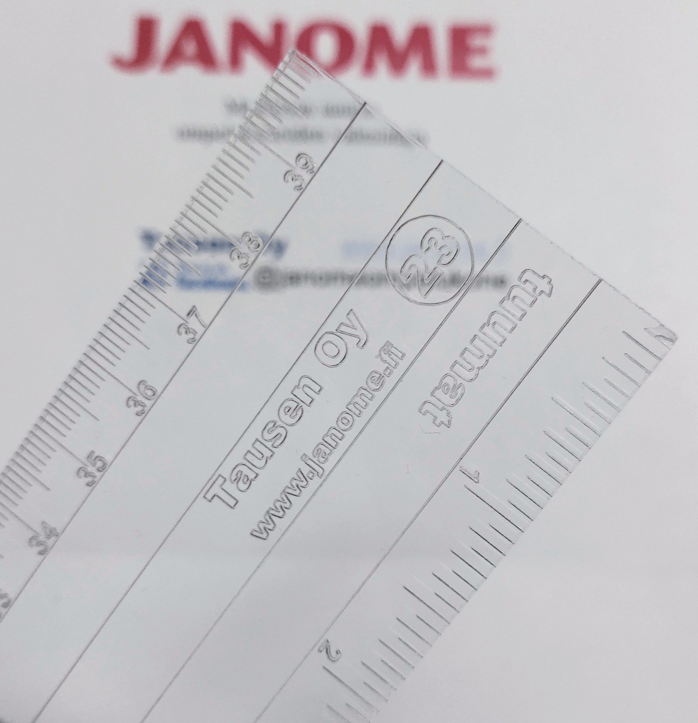 Kaavain 23 on 40 cm pitkä ja 5 cm leveä 4mm paksu läpinäkyvä akryyliviivain sentti- ja tuuma-asteikolla. Viivaimessa poikittaisviivat sentin välein. Viivaimen  avulla saat ommeltua suoria ommelrivejä tasaisin välein kaavainjalkaa(ruler foot) käyttäen.