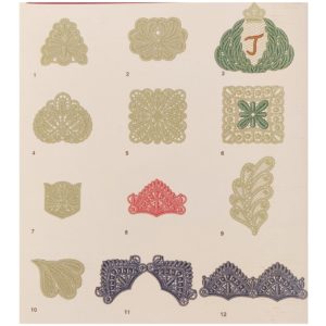 Kirjontakuvio kortti Lace collection (1013) sisältää 12 erilaista pitsikuviota.