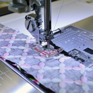 Pikakiinnityksellä oleva läpinäkyvä 1/4″ saumausjalka on yhteensopiva suoraommel pistolevyn kanssa kun neula keskiasennossa.