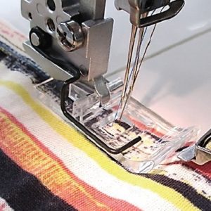 Läpinäkyvä paininjalka ohjaimella kantinkääntäjälle peitetikkikoneeseen, helpottaa kantin ohjaamisessa että tikkaus pysyy tasaisesti samassa kohdassa. Paininjalka käy Janome 1000CP/CPX, 2000CPX, CoverPro 3000P ja Elna EasyCover koneisiin.