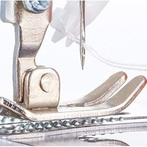 Pakkauksessa 1/8″ ja 3/16″ tereen ompelujalat pikakiinnityksellä ohuemmalle (3mm) ja paksummalle (5mm)tereelle.