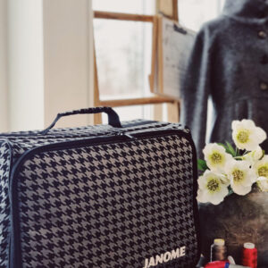 Musta-harmaa ompelukonelaukku olkahihnalla.
