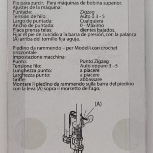 Parsinjalka laakasukkula koneisiin, kiinnitetään paininjalan tankoon (matalakiinnitys, low shank). Käytetään myös vapaatikkaukseen. Ommellaan syöttäjät alaslaskettuna.
